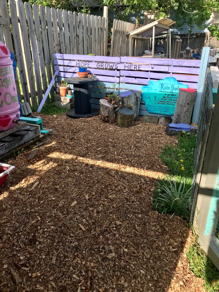 I do believe this is better than our last load and we received significantly more this time. We went over our existing mulched areas and added to new spots around the property. Check out the transformation in the children’s area in the pictures below!